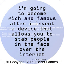 Stab People buttonThis standard size 2.25″ button lets everyone know how you feel about some people on the internet. Button is the bash.org quote, “i’m going to become rich and famous after i invent a device that allows you to stab people in the face over the internet.”